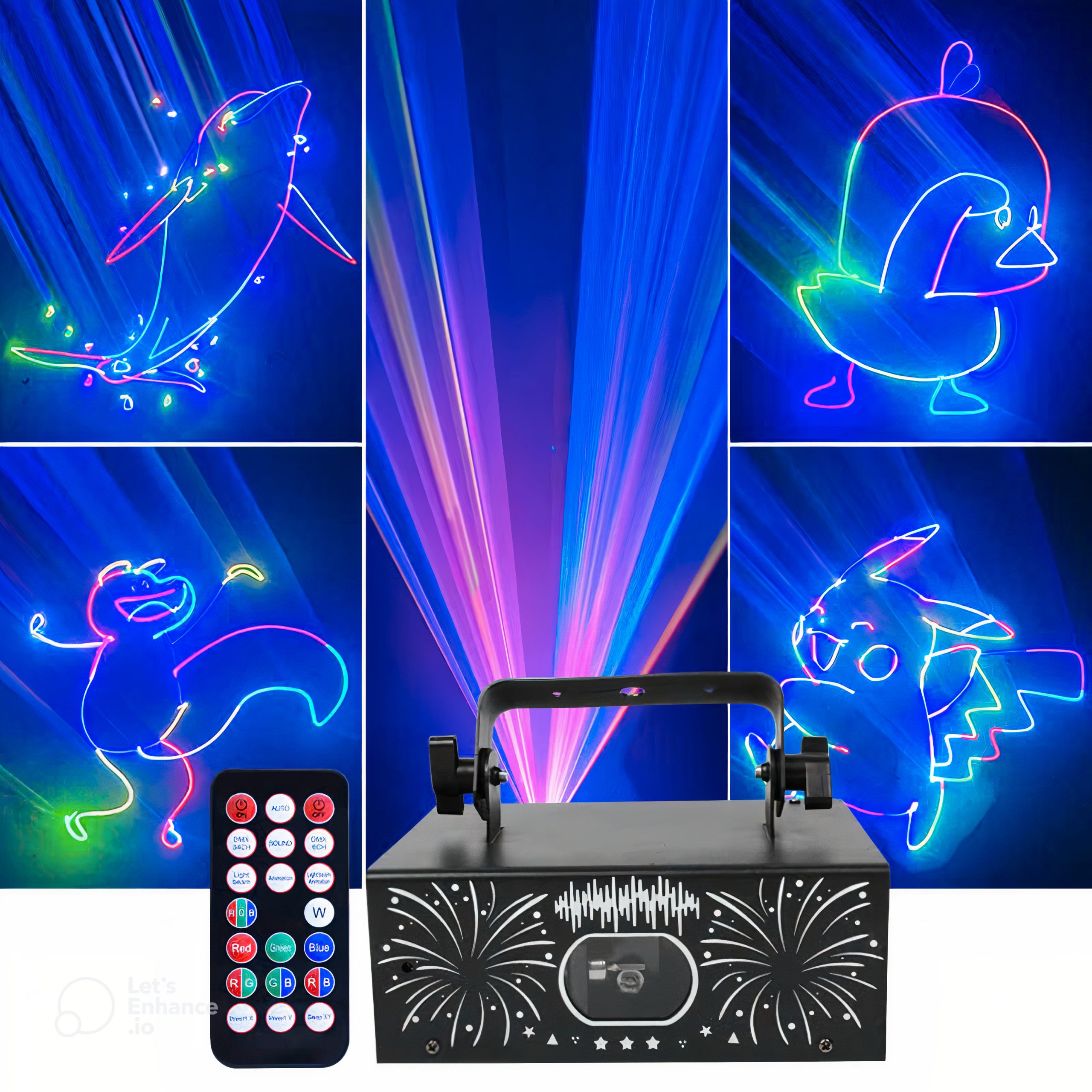Đèn chiếu laser với 1000 hiệu ứng 3D đẹp mắt, huyền ảo như :Quét tia, Chiếu hình, Hoạt hình, Hiệu ứng nước, Gobo Hoa laser, Hiệu ứng Laser chùm với 3 kênh riêng biệt: Cảm biến theo nhạc, Kênh hình thú, Kênh quét tia